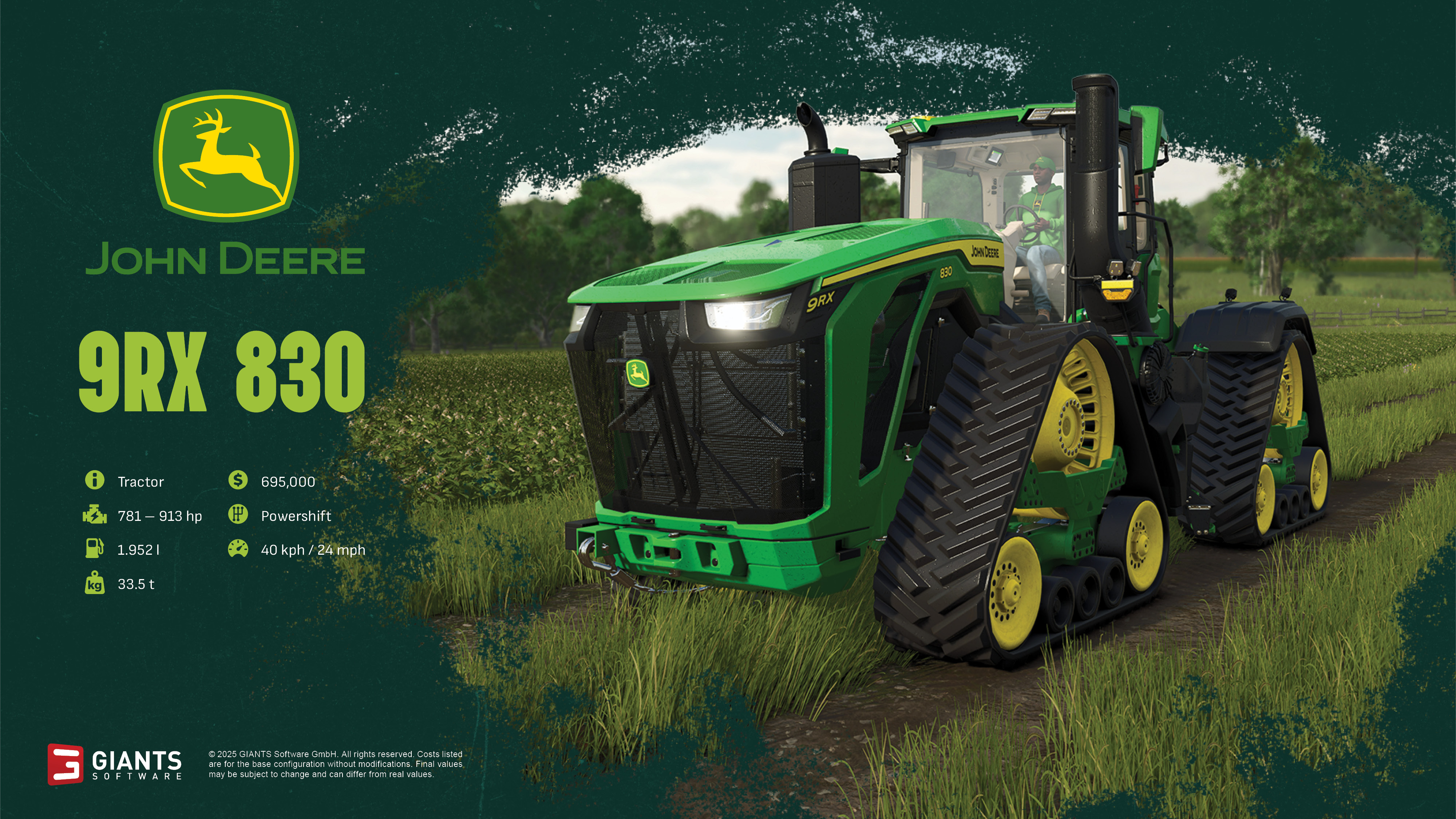 Built for very large-scale, high-draft tillage, seeding, and heavy implement work, it combines an 18‑liter Deere engine, high-capacity hydraulics, and a heavy, high-traction chassis - making it the biggest, most powerful tractor in Farming Simulator 25.