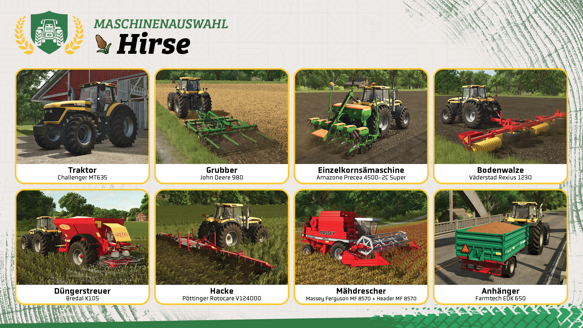 - Ihr benötigt einen Mähdrescher mit passendem Getreideschneidwerk für die Ernte von Hirse.