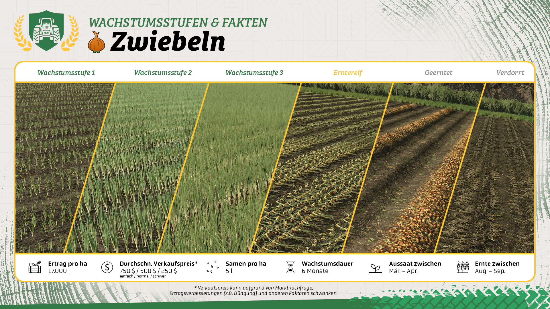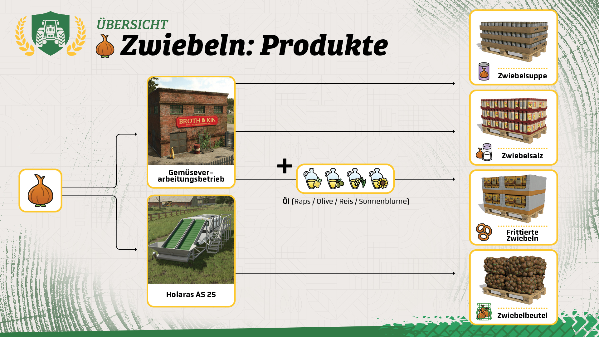 • Wenn ihr eure Zwiebeln verkaufen möchtet, dann verpackt sie mit dem Zwiebelentschloter Holaras AS 25 für mehr Gewinn. Ihr findet die platzierbare Maschine im Baumenü.